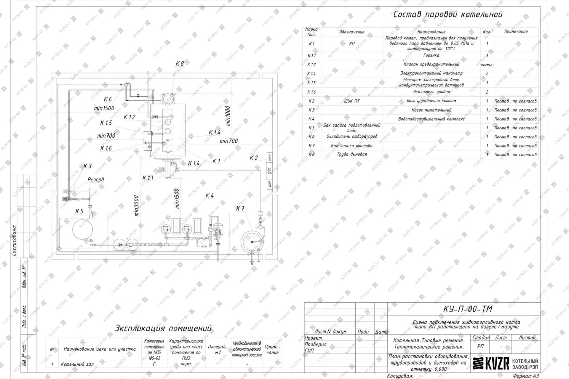 Монтаж парового котла КП 2000 на мазуте в котельной должен производиться в соответствии с проектом и с учетом требований Свода правил СП 89.13330. 2016 «Котельные установки» и «Правил устройства и безопасной эксплуатации паровых котлов с давлением пара не более 0,07 МПа (0,7 кгс/см2), водогрейных котлов и водоподогревателей с температурой нагрева воды не выше 388 К (115 С)». Правильный монтаж котла – залог его надежной и долгой работы.