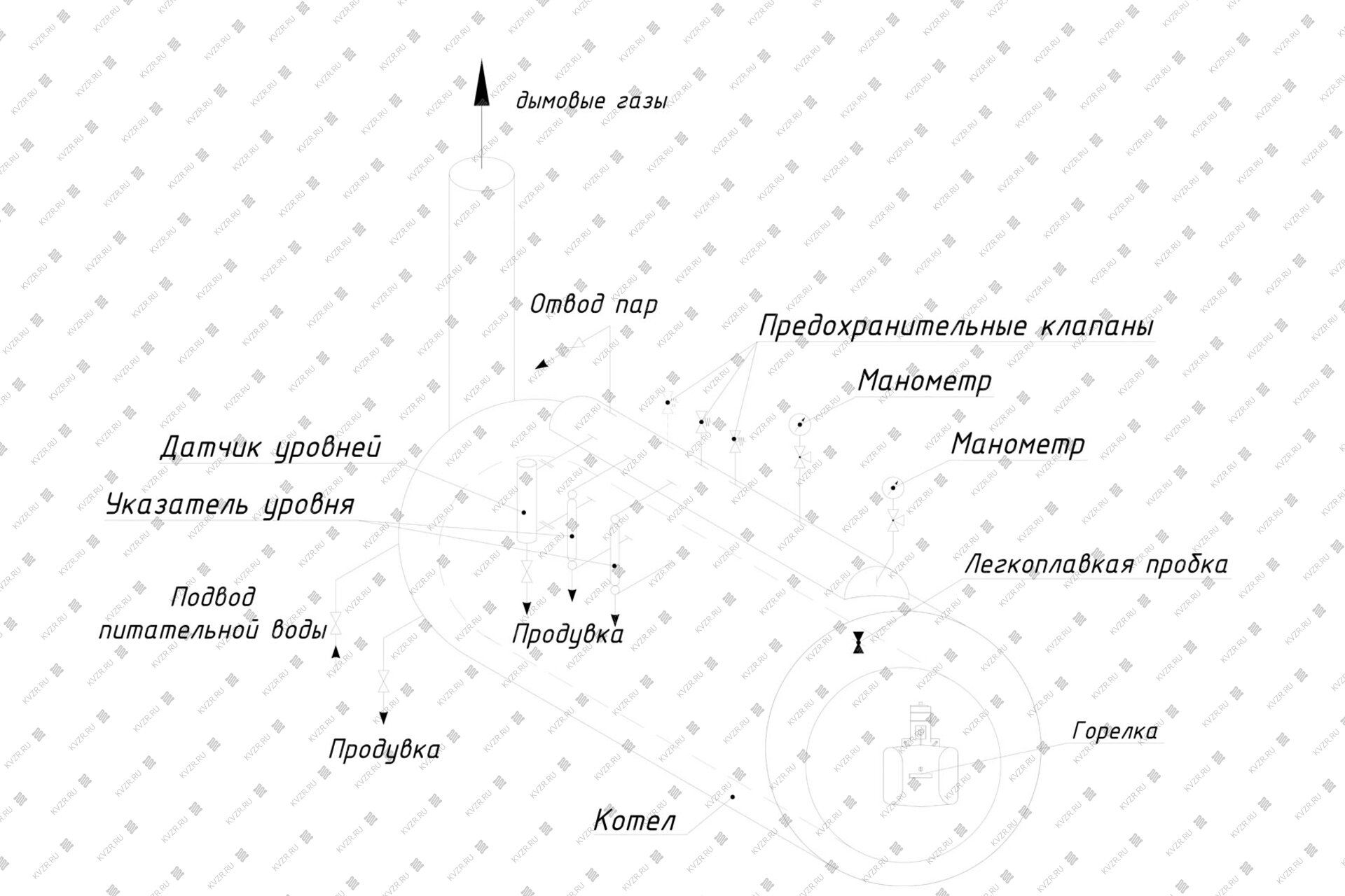 Теплообменник изготавливается из двух стальных цилиндров разного диаметра, вставленных один в другой и соединенных между собой фланцами и конвективными трубами. В верхней части теплообменника приварен паросборник, представляющий собой полуцилиндр. Конвективный трубный пучок соединяет верхнюю и нижнюю часть водяной рубашки котла, пар образуется при испарении нагреваемой воды и собирается в паросборной камере, далее через паропровод направляется потребителю на технологические нужды. Дымовые газы проходят через трубный пучок и выходят в верхней части котла. В передней части жаровой трубы размещена топка амбразурой под горелку, а в задней части - конвективный пучок труб. Топливо подается через горелку, паропроизводительность регулируется путем увеличения или уменьшения количества топлива. Температура сухого насыщенного пара высокого давления регулируется изменением давления пара, чем ниже давление пара, тем ниже температура.