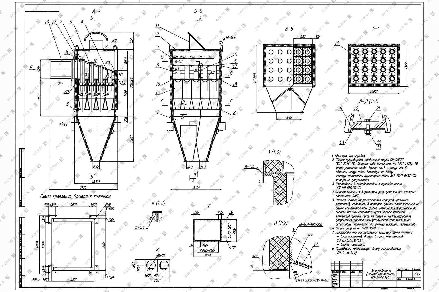 Агрегат БЦ 2 состоит из параллельно установленных чугунных циклонных элементов, объединенных в одном корпусе и имеющих общие подвод и отвод газов, а также сборный двухсекционный бункер.