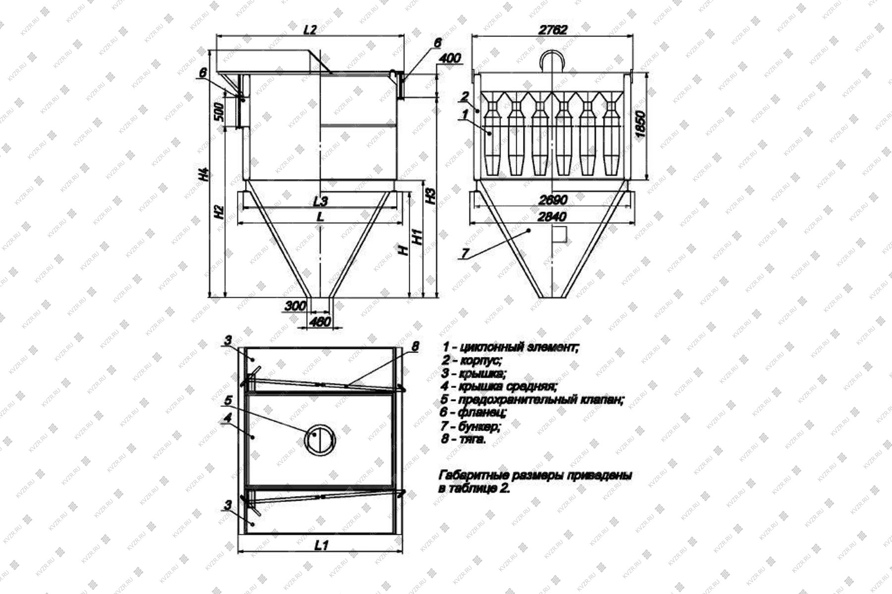 Бункеры имеют пирамидальные форму. Аппарат группового исполнения изготовляют с "левым" и "правым" вращением газового потока, одиночные - только с "правым" вращением.