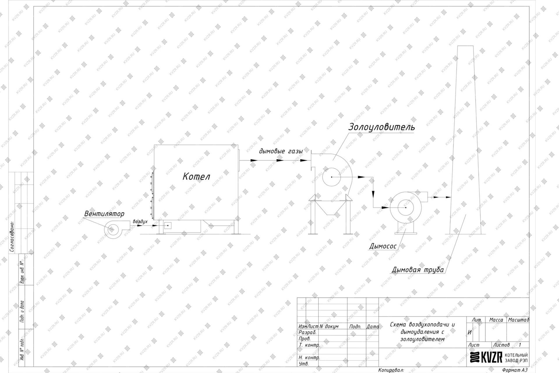 2. Горение: Воздух на горение твердого топлива подается принудительно дутьевым вентилятором. Интенсивность горения регулируется шибером на воздуховоде.
